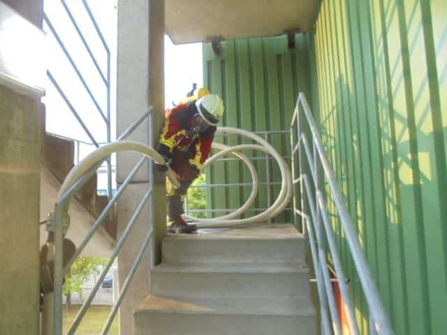 Nicht nur war somit der Ort fremd, sondern auch die Aufgaben waren besonders: Die 13 Atemschutzgeräteträger/-innen nahmen eine gefüllte Schlauchleitung vor. Der Weg führte dabei über einen Treppenaufgang in das vierte Stockwerk. Sie übten hierbei auch verschiedene Möglichkeiten der Schlauchbeförderung.