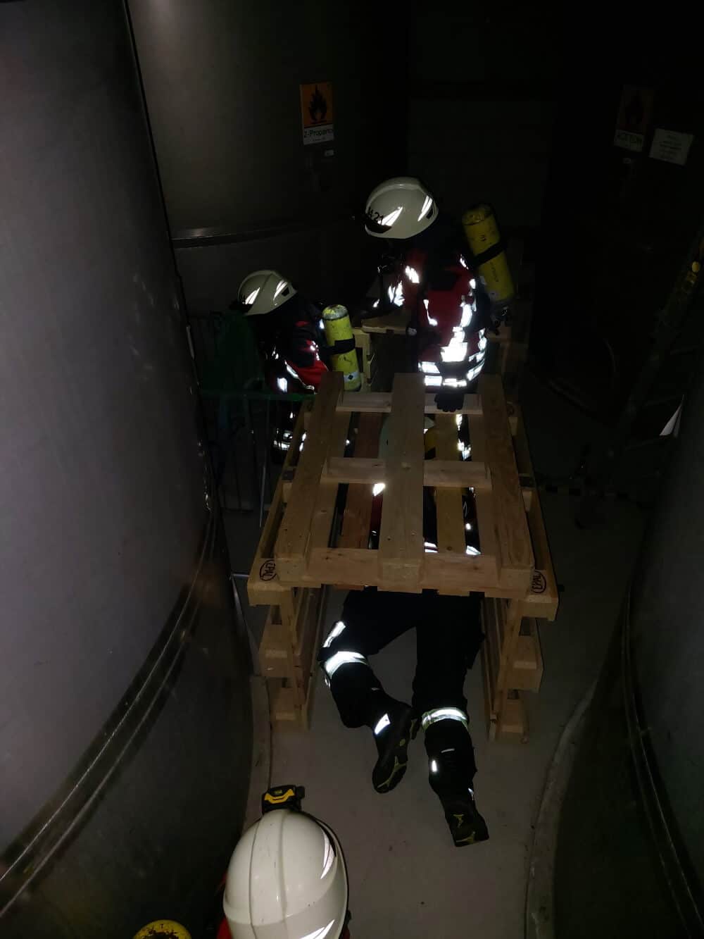 Zusätzlich beübten die Einsatzkräfte in einem Hindernisparcours in einem Tanklager die Personenrettung mit Puppen. Die Mitarbeitenden der Werkfeuerwehr Takeda begleiteten diese Übung.