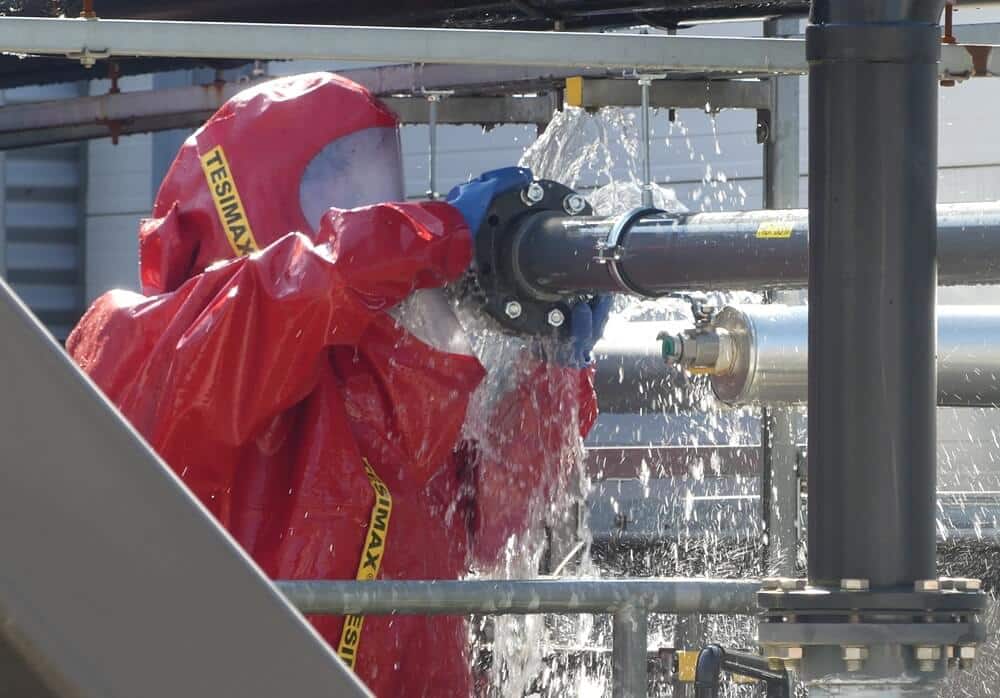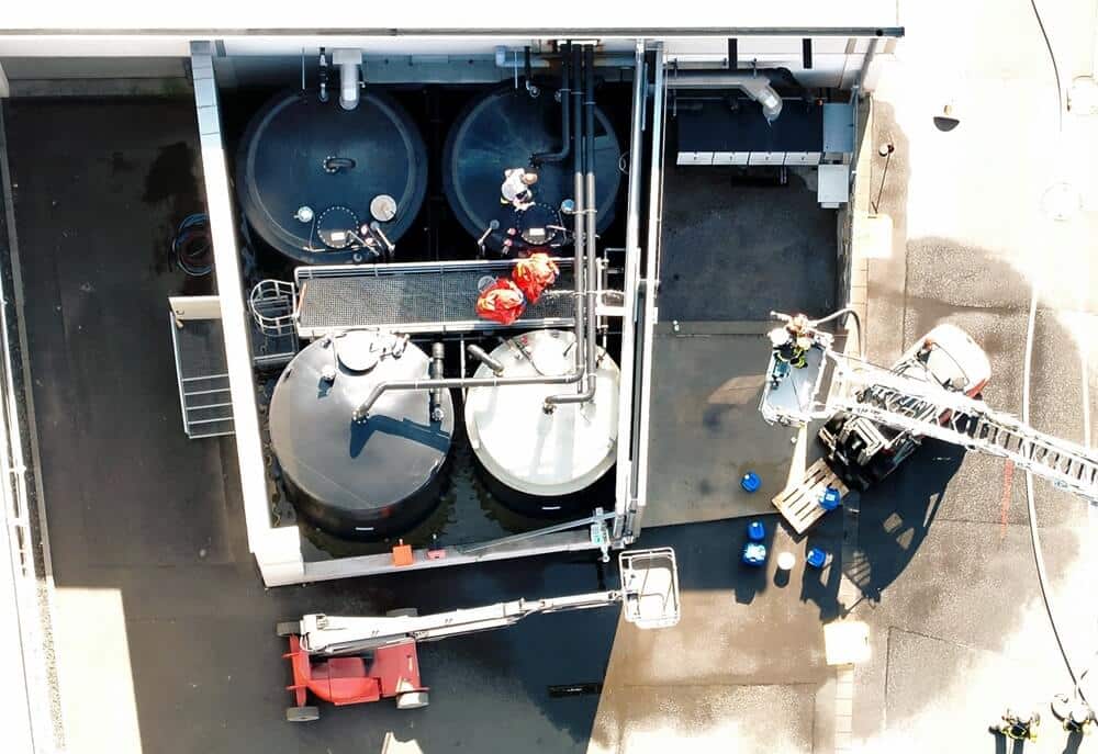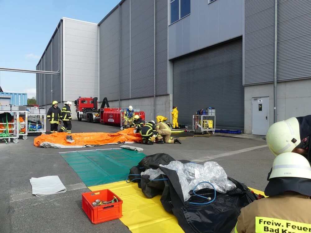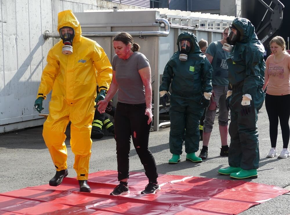 Der Stellv. Gefahrstoff-Zugführer Thomas Hillenbrand hatte ein Übungsszenario ausgearbeitet, bei dem ehren- und hauptamtliche Einsatzkräfte ihre Fähigkeiten unter Beweis stellen mussten: Bei Wartungsarbeiten an einer erhöhten Plattform sei Salzsäure durch ein Leck an einem Rohr ausgetreten und habe vier Personen verletzt. Die Verletzten – dargestellt von sehr realistisch geschminkten Freiwilligen – mussten in Sicherheit gebracht werden, während gleichzeitig die Leckage im Rohrleitungssystem geschlossen wurde.