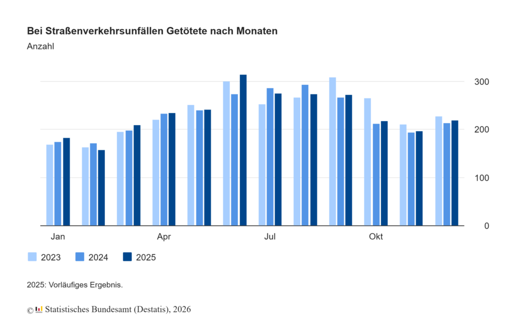 Tödliche Verkehrsunfälle: Im Jahr 2025 sind in Deutschland 2.814 Menschen bei Unfällen im Straßenverkehr ums Leben gekommen, hier die monatliche Verteilung. (Grafik: Statistisches Bundesamt, Destatis, 2026)