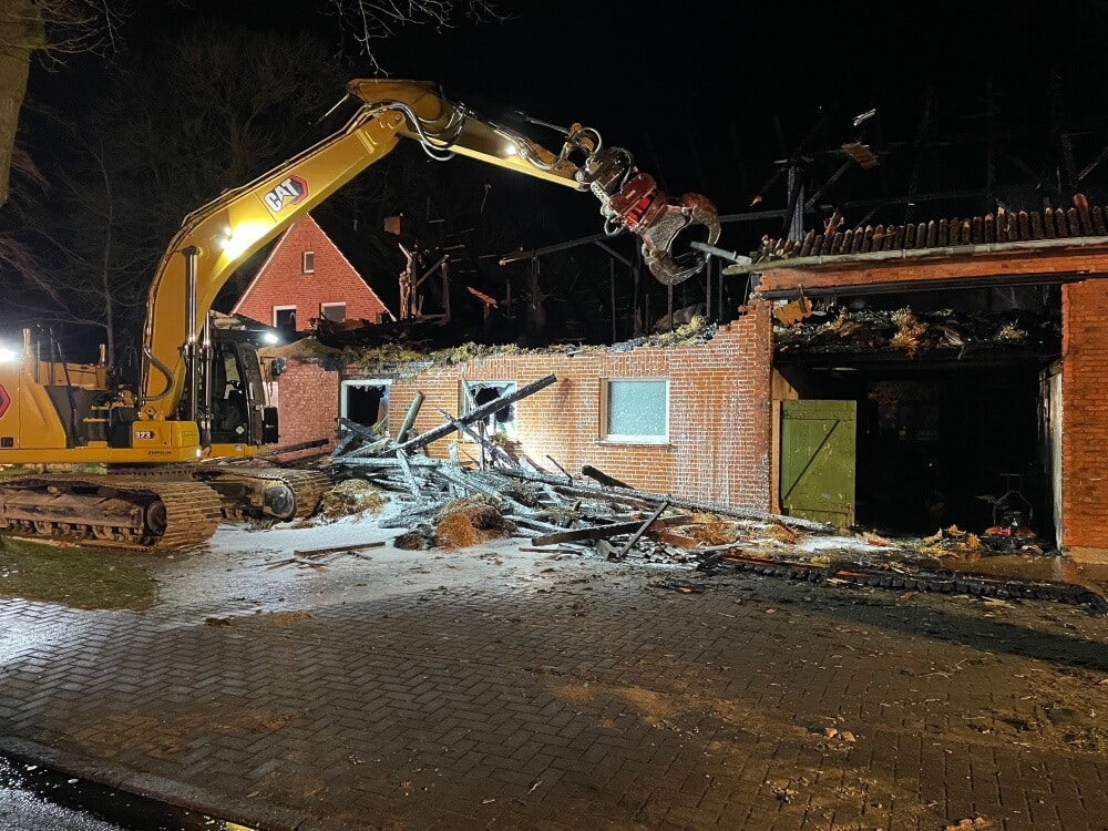 Die Feuerwehren stellten eine Riegelstellung zum Wohnhaus her. Dabei vermieden Wasserwerfer und C-Rohre den Funkenflug und die Wärmeübertragung auf das Gebäude. Die Einsatzkräfte kühlten dabei auch das Dach des 70 x 20m großen Stalls, das zu diesem Zeitpunkt noch nicht lichterloh in Flammen stand, herunter. Die Einsatzkräfte bekämpfen den Brand mit Drehleitern von oben. Mit Hilfe eines Baggers trugen Feuerwehrkräfte den Dachstuhl und Mauern ab. Gerade auf dem Dachboden war Vorsicht geboten: Dort lagerten Strohballen, die die Einsatzkräfte einzeln ablöschten.